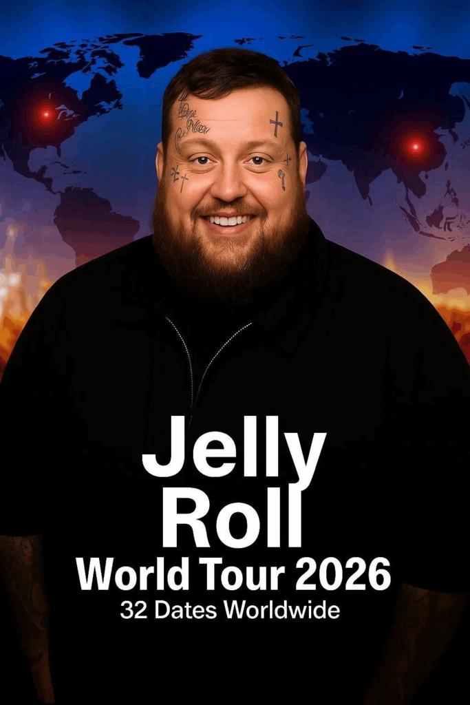 Nashville, TN — Jelly Roll has officially lit the fuse on what may become the most emotionally charged and spiritually uplifting country tour of the decade. The “Redemption Road World Tour 2026” just dropped its full schedule — revealing 32 explosive dates across North America, Europe, and Australia, marking Jelly Roll’s most ambitious global run yet.