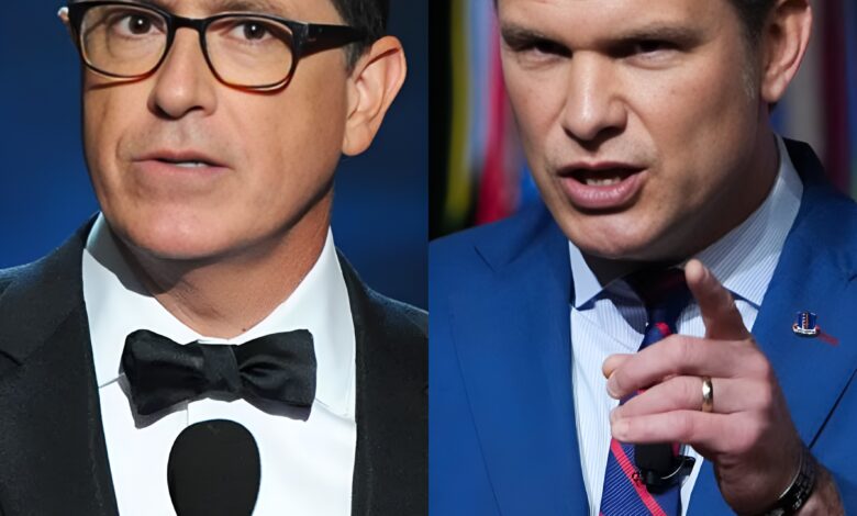 But the real scorcher—the line that’s got the internet buzzing like a hornet’s nest on Red Bull—came next, a scathing follow-up that peeled back the humor to reveal raw, seething animus. As the applause crested, Colbert’s grin faded into something darker, almost confessional. “Look, Pete,” he said, voice dropping to a husky whisper that silenced the room, “you wear that cross like it’s armor, preaching virtue from your Fox perch while the ghosts of your scandals—booze-fueled brawls, that payout to silence the assault claims, the tattoos you hide like shameful scars—they whisper louder than any sermon. You’re not liberating warriors; you’re just the latest mask for a machine that chews them up. And if integrity’s a battlefield, son, you’ve been AWOL since boot camp.”