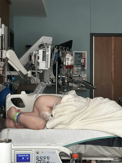 These moments — a few careful sips, a pause without nausea — are victories measured not in milestones, but in mercy. His body is visibly swollen from IV fluids, part of the chemotherapy detox process, a reminder of just how much his system has endured over the past week.