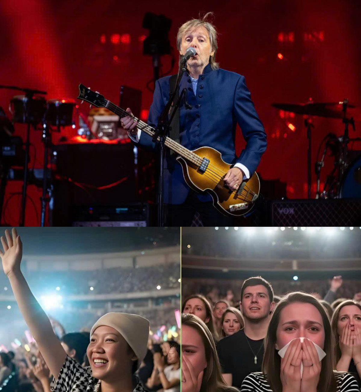 From the quiet, a single voice rose. Then another. Then ten. Then hundreds. And before anyone understood what was happening, the entire arena — parents, children, grandparents, teenagers who weren’t even alive when The Beatles topped the charts — lifted the moment from Paul’s hands and carried it for him.