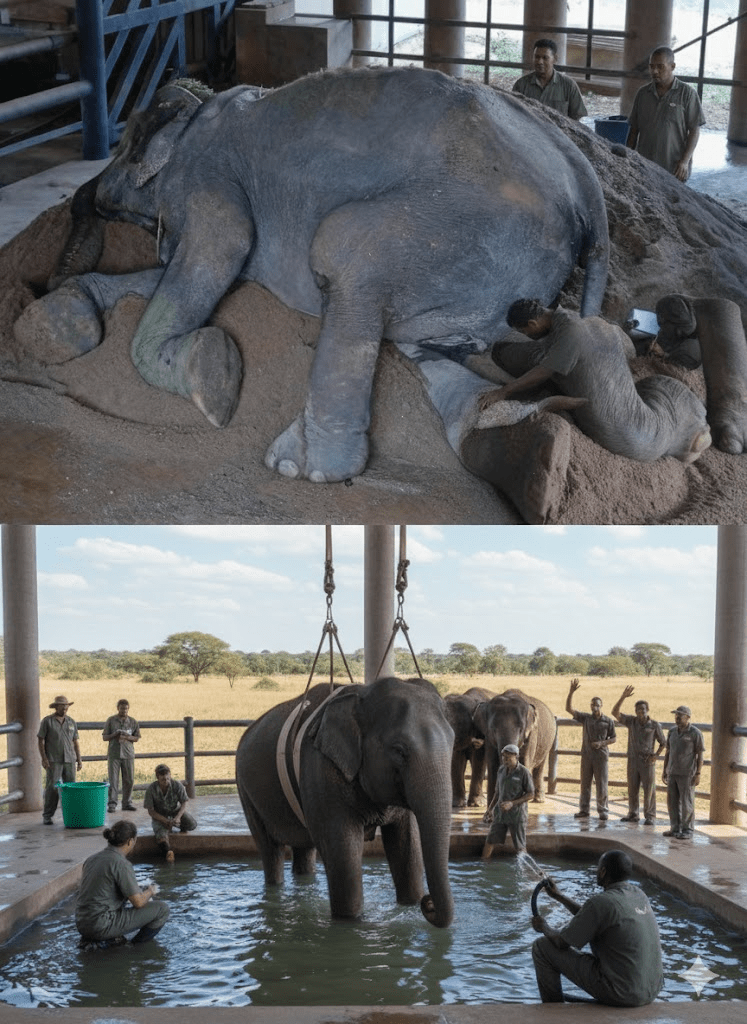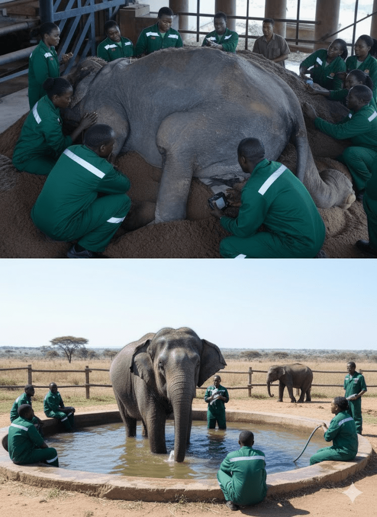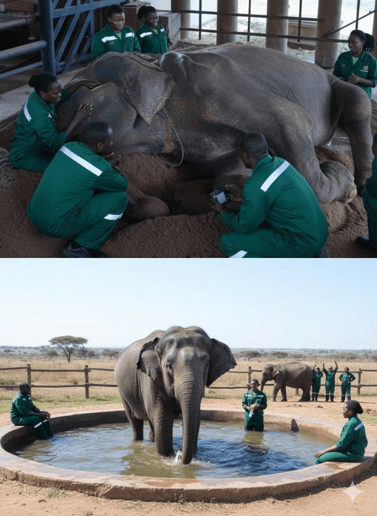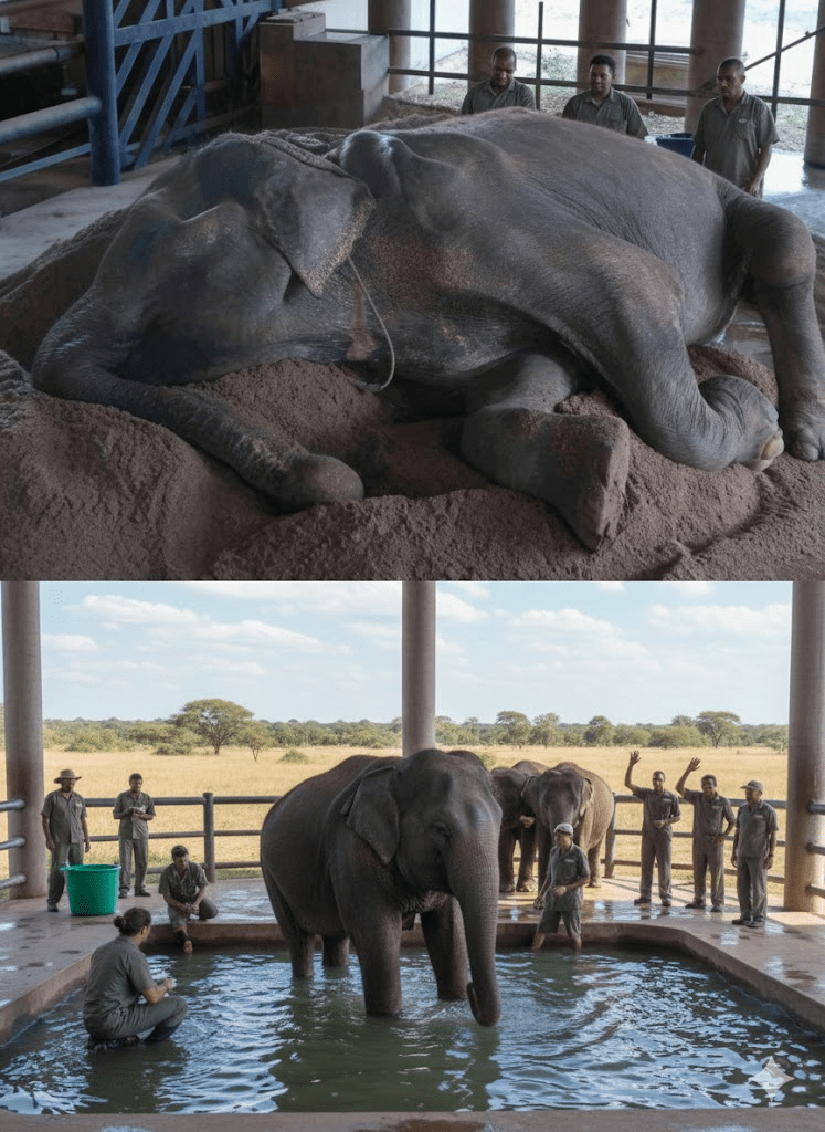 This thoughtful presentation of comfort, safety, and nourishment was the first tangible expression of the compassion that now defined her world. The moment was observed by her new caretakers, who understood the monumental significance of this transition. They watched, holding their breath, as the old elephant took in her surroundings. Almost immediately, as if compelled by an instinct long suppressed, SomBoon slowly knelt, her massive body easing down onto the yielding softness of the sand. She didn’t hesitate or stand guard; she simply lay down—a posture of ultimate surrender and trust that was deeply moving to witness.