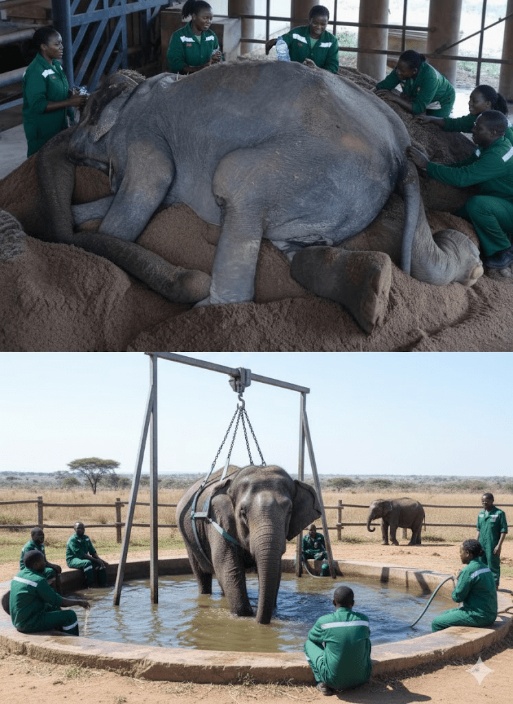 The initial moments of her rest were also a demonstration of the sanctuary’s unwavering commitment to her wellbeing. While her spirit was finding peace, the physical toll of decades in chains remained a reality. Her legs, fragile and stiff from years of unnatural strain on hard surfaces, presented a significant challenge. The sheer effort required for an elephant of her size to rise from a prone position, even on soft sand, was considerable. Recognizing this, the caretakers did not leave her side. They stayed close, maintaining a respectful but watchful distance, ready at a moment’s notice to provide