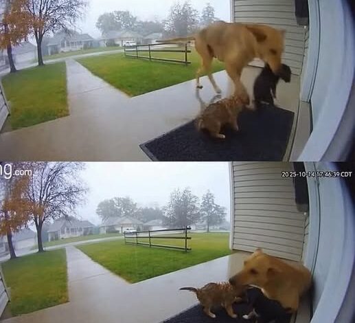 Then, one stormy day, a drenched stray mother dog appeared, carrying her tiny puppies to the widow’s porch for safety.