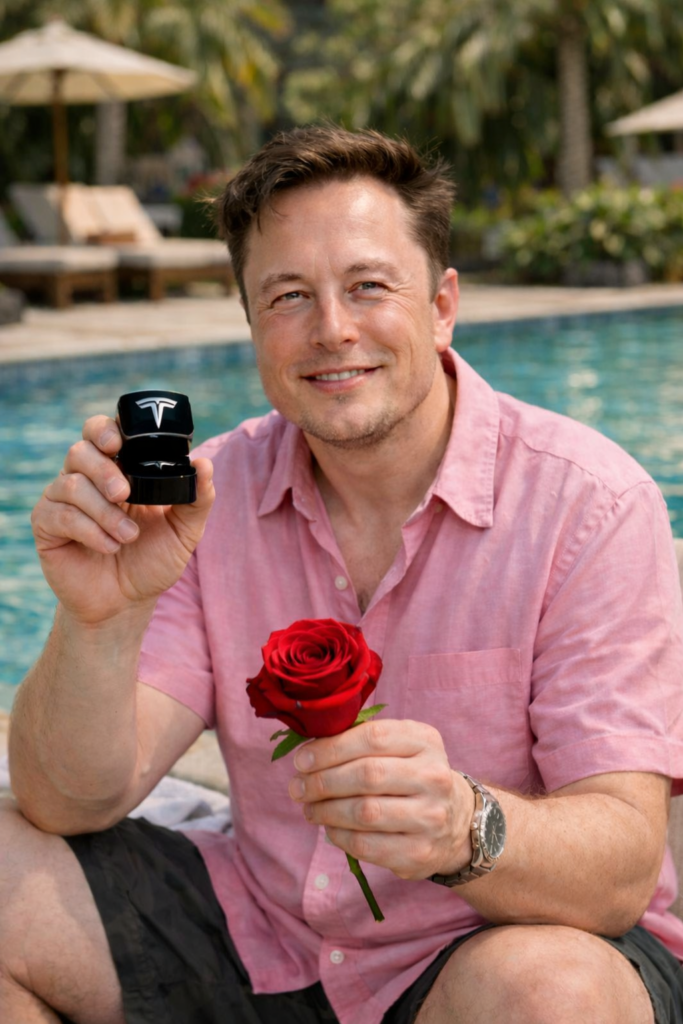In one hand, Musk is seen holding a flower, while in the other he appears to be presenting a ring that many believe could be an engagement ring. His calm smile and the romantic setting immediately sparked speculation across the internet.