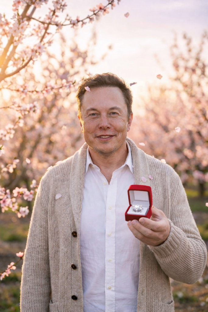 Newly surfaced images circulating online appear to show Elon Musk standing in the middle of a blooming garden, holding a bright red ring box that reveals a sparkling diamond inside. The moment looks intimate, almost cinematic — but what has truly captured the internet’s attention is the setting behind him.