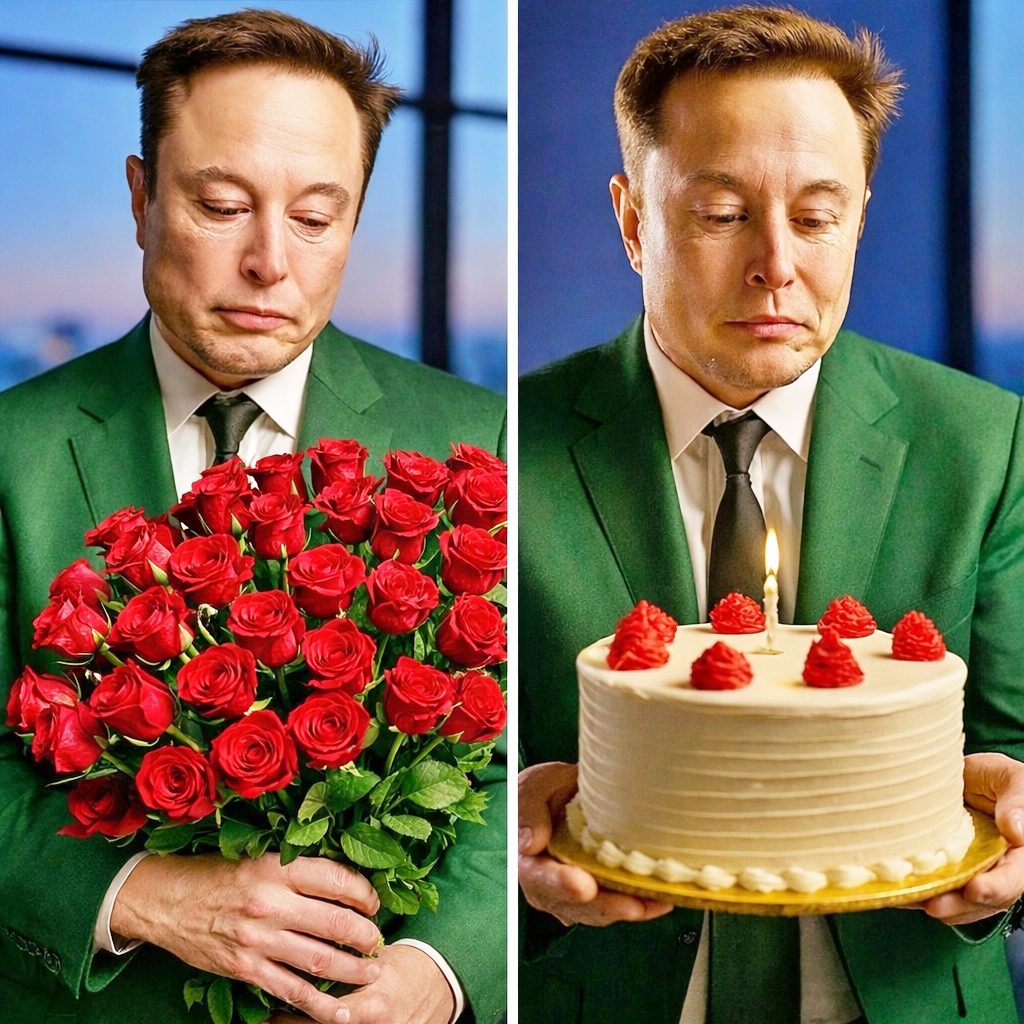 In a quiet room filled with soft daylight, Elon Musk stood alone — holding a bouquet of red roses and a small birthday cake.