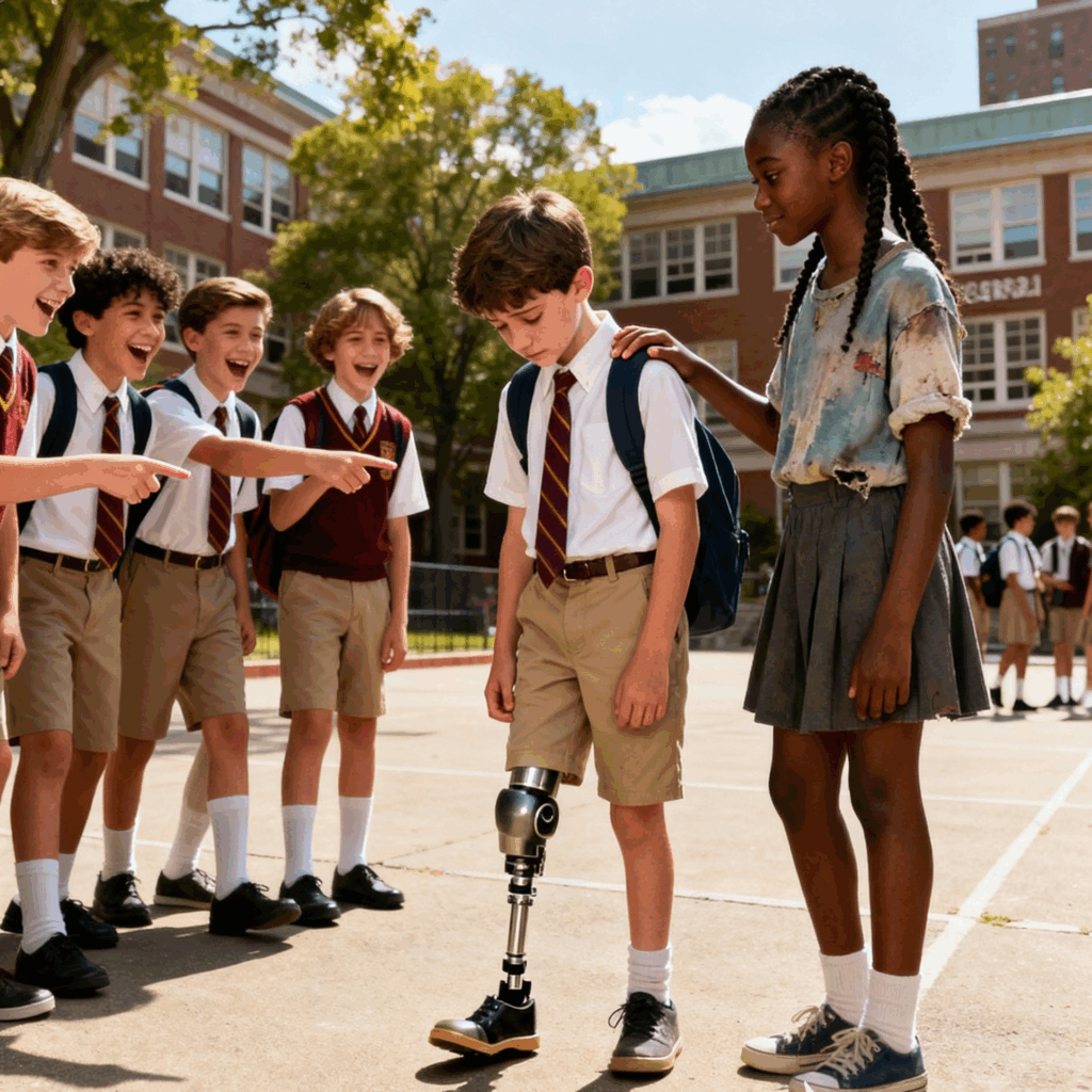 That morning was worse than usual. A group of boys blocked his path in the courtyard, smirking. “Race us, robot boy,” one sneered. “Bet you won’t make it to the first step!” Laughter erupted, sharper than the cold winter wind. Leo lowered his gaze, wishing the ground would swallow him.
