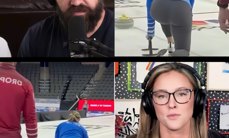 In the world of the NFL, the Kelce family has always stood for grit, humor, and unfiltered authenticity. But in January 2026, the spotlight shifted from the football field to a viral video that sparked a firestorm of controversy. When Kylie Kelce appeared on the “New Heights” podcast in a pair of skin-tight gray sweatpants while learning to curl, the internet didn’t focus on her athletic skills. Instead, they focused on her “large” postpartum curves. While Kylie handled the comments with her signature wit, a luxury brand took the insults to a dangerous level, leading to a confrontation that has left fans everywhere stunned.