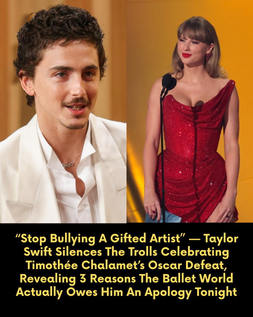 The 2026 Oscars were supposed to be the pinnacle of Timothée Chalamet’s career. Instead, the night turned into a sickening display of public “Schadenfreude.” As Michael B. Jordan hoisted the Best Actor trophy, the internet erupted in a celebratory bonfire, claiming Timothée’s loss was “karma” for his controversial comments about ballet and opera. But while the world was busy mocking the “Final Boss” of cinema, the most powerful woman in music, Taylor Swift, decided she had seen enough. In a move that has silenced the trolls overnight, Taylor stepped in to protect the young actor, offering a perspective so sharp it has left his critics trembling.