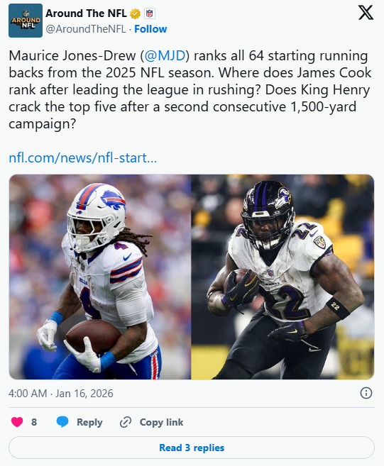 The latest example came when NFL Network analyst Maurice Jones-Drew released his2025 running back rankings, placing the Buffalo Bills standout at No. 4 overall.