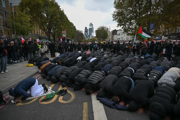 Palestinian and Bangladeshi flags were seen as demonstrators prayed in the street on Saturday|