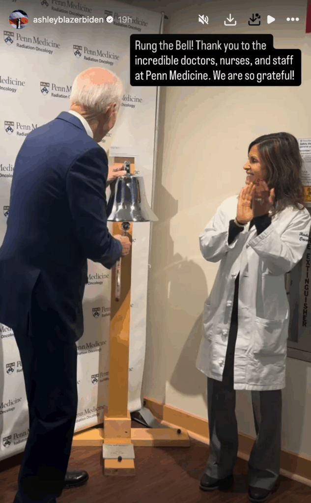 “Dad has been so damn brave throughout his treatment. Grateful,” Ashley captioned the pic.Joe Biden “rings the bell” after completing radiation treatment on Oct. 20, 2025.