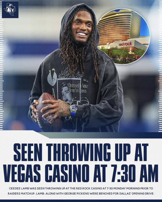 Although nothing has been confirmed, a rumor is circulating that Lamb was spotted “throwing up” at the popular Red Rock Casino at 7:30 a.m. on Monday, which may have led to Schottenheimer’s decision to bench him.