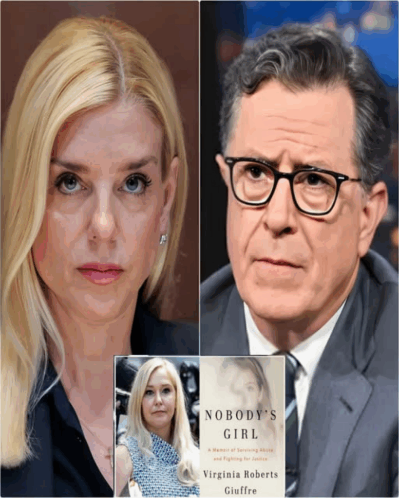 “I would encourage Pam Bondi to read Nobody’s Girl,” Colbert said, his tone measured but unmistakably pointed.