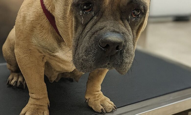 At the vet clinic, everyone gasped when Rubble stepped on the scale — she weighed only 44 pounds, less than half the healthy weight for a dog her size. Her body told the story of neglect: open sores, patches of missing fur, and inflamed skin caused by malnutrition and fleas.