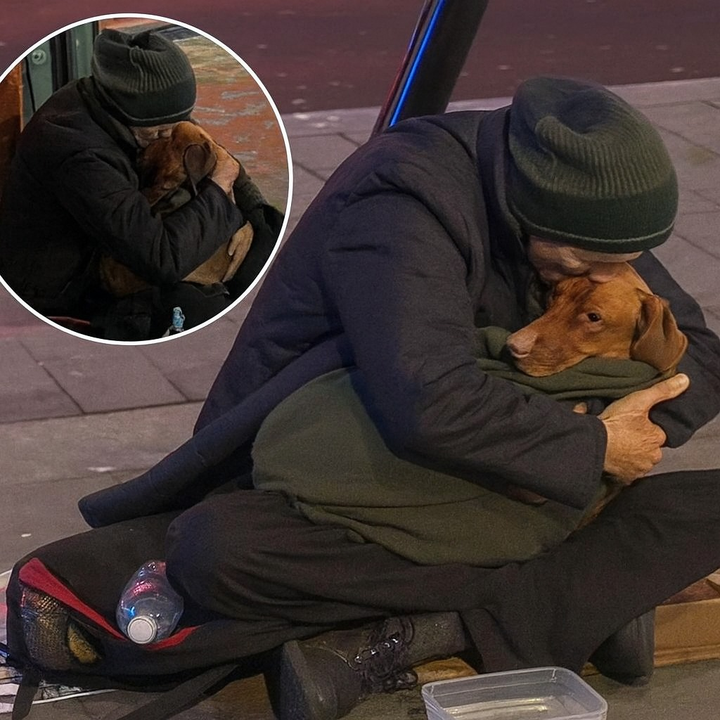 A homeless man, bundled in worn layers, gently cradled his dog in his arms, swaying back and forth as though the city around him were a distant hum.
