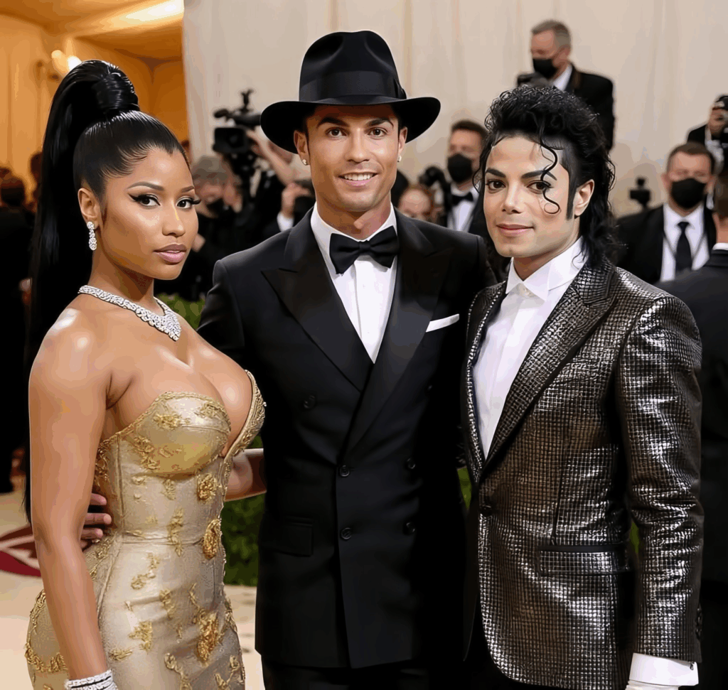On one side stood Nicki Minaj, the Queen of Rap — fierce, fearless, and full of fire. Her powerful verses lit up the stage, commanding every heartbeat in the arena. On the other, Cristiano Ronaldo, football’s living legend, known not just for his strength and precision on the field, but for his unshakable charisma and global influence. And then… the screen behind them came alive — Michael Jackson, the eternal King of Pop, appeared in a breathtaking digital tribute, his voice and moves perfectly synced to the beat. The crowd gasped — some screamed, others simply stood in tears, realizing they were witnessing a bridge between past and present, humanity and immortality.