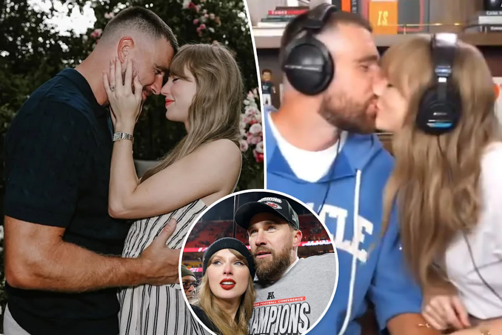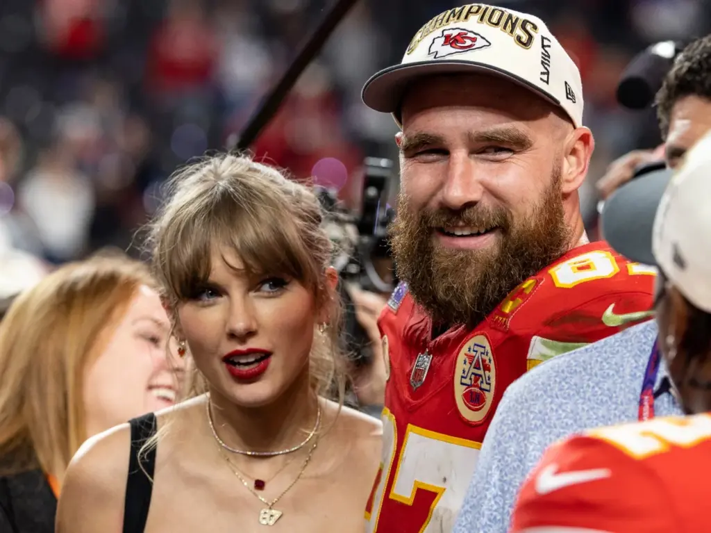 Just Taylor Swift and Travis Kelce, sitting in a plain room, speaking directly to the camera.