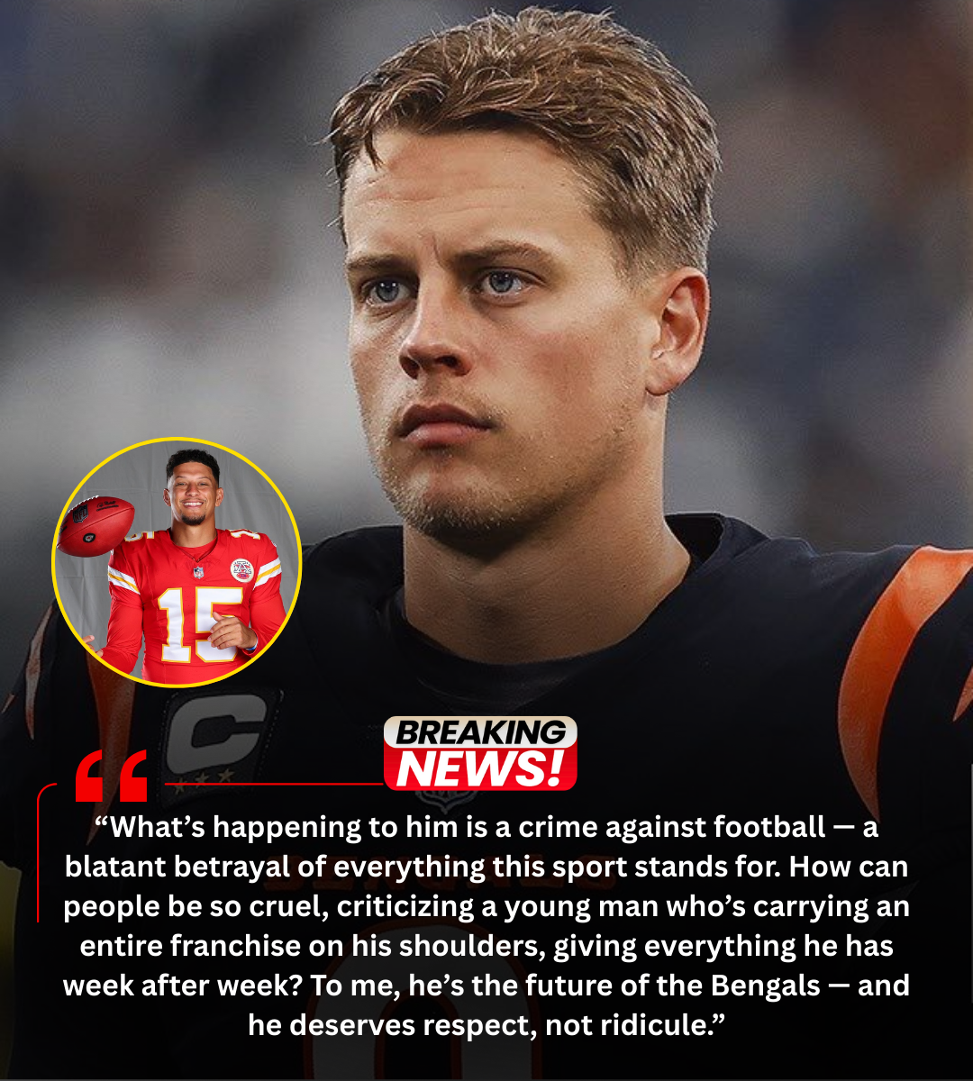 In a dramatic move that transcended the fierce rivalry between the Kansas City Chiefs and the Cincinnati Bengals, reigning NFL MVP Patrick Mahomes shattered the silence surrounding the recent struggles of quarterback Joe Burrow. Mahomes, known for his on-field intensity but often measured public statements, released an electrifying and emotional defense of Burrow just ten minutes ago, using language rarely heard between professional competitors.