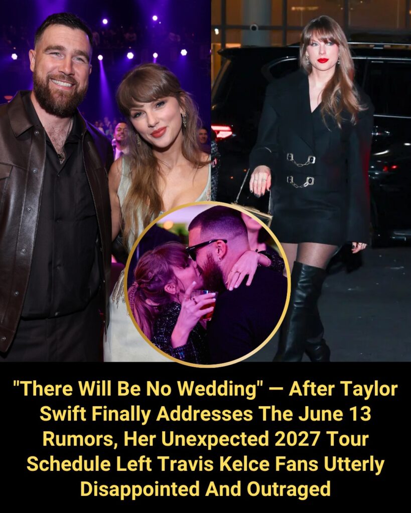 But today, the dream didn’t just fade—it was dismantled. In a move that has sent shockwaves through the entertainment industry, Taylor Swift has officially addressed the June 13 wedding rumors. Her answer? A definitive “No.” But it’s the reason why that has sparked a massive wave of outrage and disappointment among Travis Kelce’s most loyal supporters. Instead of a wedding dress, Taylor is putting back on the sequins for a massive 2027 World Tour expansion.
