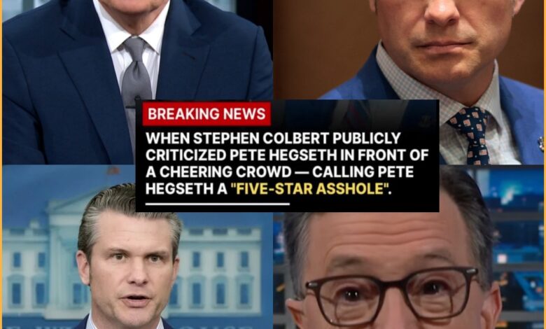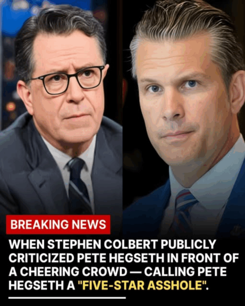 Có thể là hình ảnh về Phòng Bầu dục và văn bản cho biết 'BREAKING NEWS WHEN STEPHEN COLBERT PUBLICLY CRITICIZED PETE HEGSETH IN FRONT OF A CHEERING CROWD- CALLINGPET CALLING PETE HEGSETH A "FIVE-STAR ASSHOLE". QUSE'