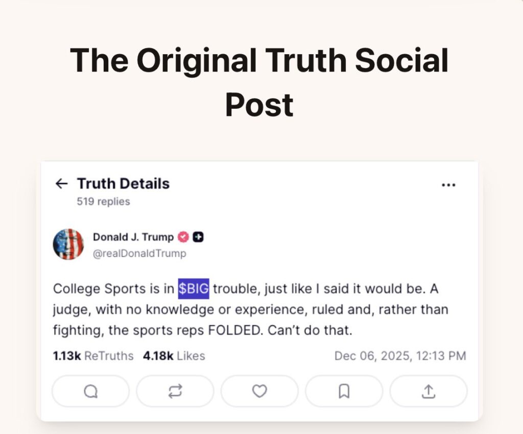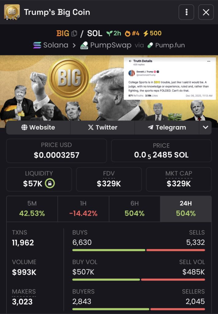 The crypto community had barely digested its morning caffeine when screenshots began circulating of a Truth Social post in which the former president allegedly dropped the word “$BIG” into a rant about college sports. Within minutes, half the traders on Solana were pounding their keyboards like they were trying to restart civilization.