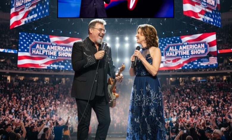 Nashville is alive tonight — the kind of electric, heart-stirring energy that only happens when something bigger than entertainment is about to unfold. Under the bright Tennessee lights, two of America’s most beloved voices — Vince Gill and Amy Grant — are preparing to step onto the stage together to open The All-American Halftime Show, a faith-filled, patriotic celebration that’s being called the boldest alternative to Super Bowl 60’s main event in decades.