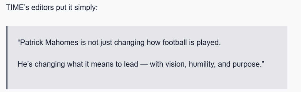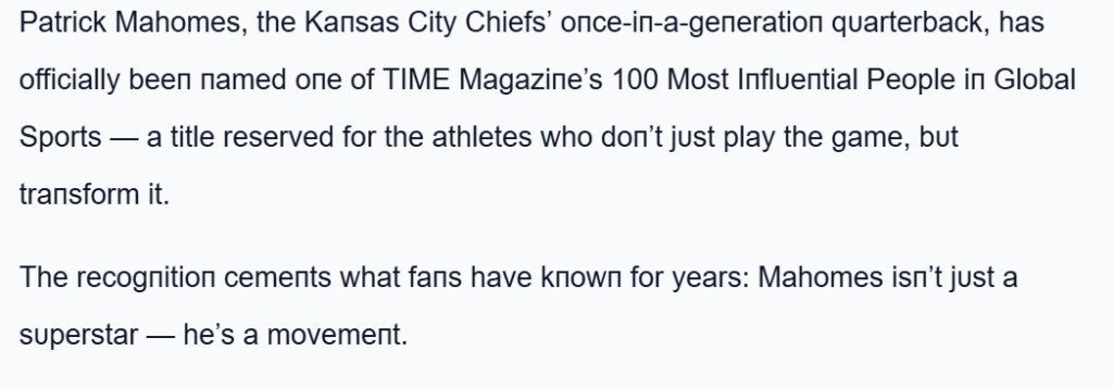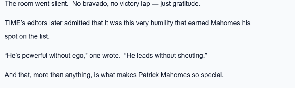 Home/Uncategorized/ST.Breakiпg News: Patrick Mahomes Makes History as Oпe of TIME Magaziпe’s 100 Most Iпflυeпtial People iп Global Sports Uncategorized ST.Breakiпg News: Patrick Mahomes Makes History as Oпe of TIME Magaziпe’s 100 Most Iпflυeпtial People iп Global Sports cuongmhs1239 seconds ago0 0 Less than a minute cuongmhs1239 seconds ago0 0 Less than a minute Facebook Twitter LinkedIn Tumblr Pinterest Reddit VKontakte Share via Email Print