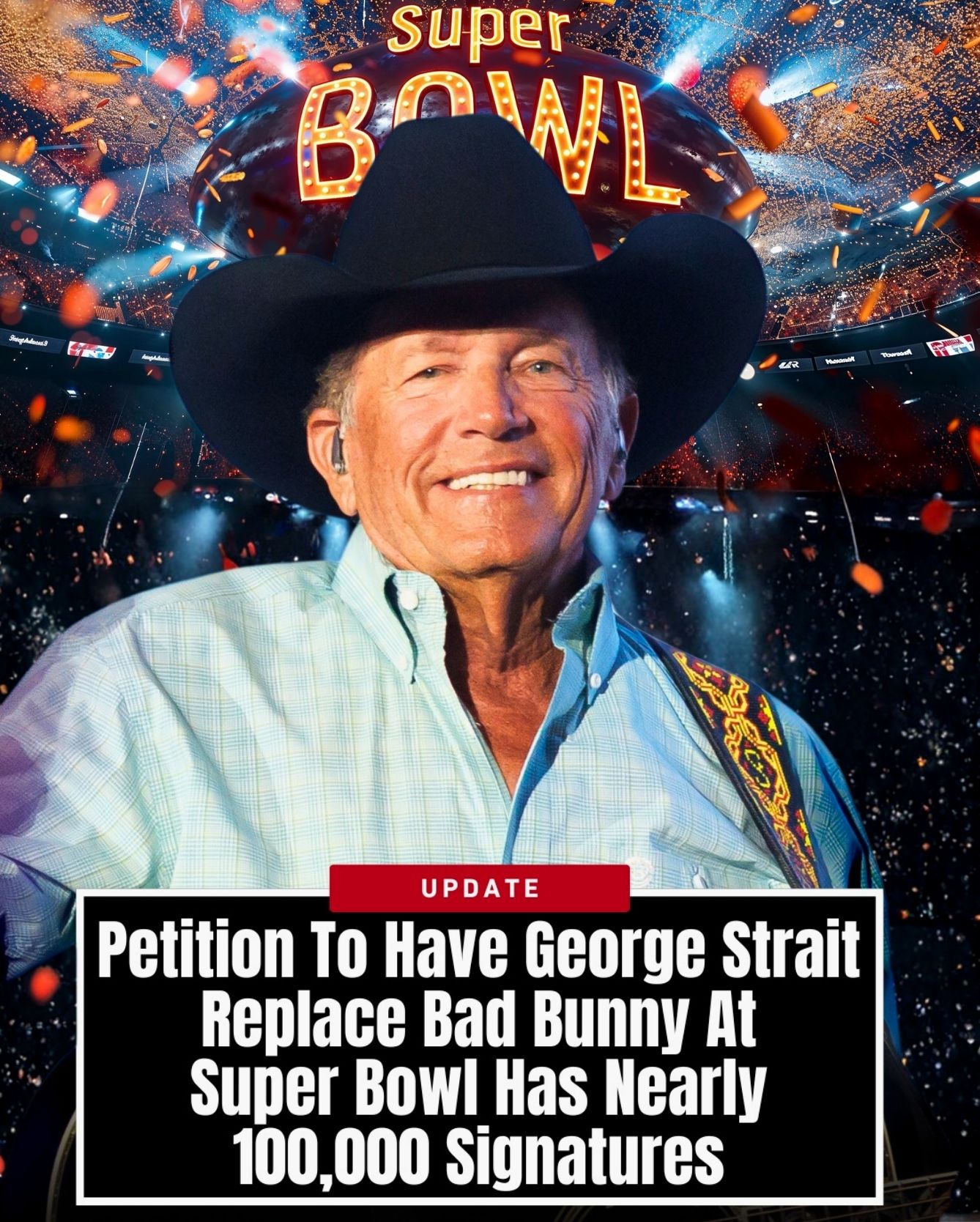 ST.Fans Demand a Change: Petition Calls for George Strait to Replace Bad Bunny at the Super Bowl. When Bad Bunny was announced as the Super Bowl halftime performer, the reaction wasn’t all cheers. One determined fan launched a petition to have George Strait — the King of Country — take his place, and it’s quickly gaining momentum