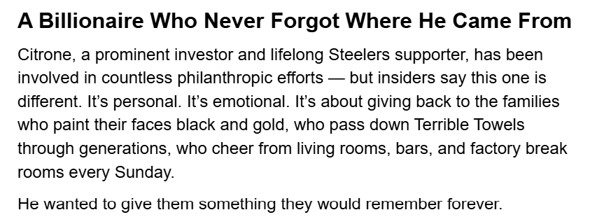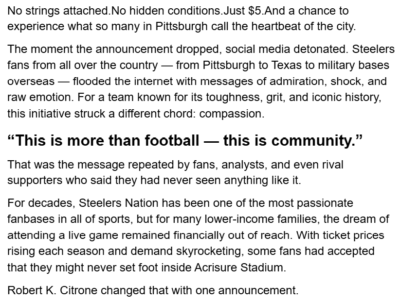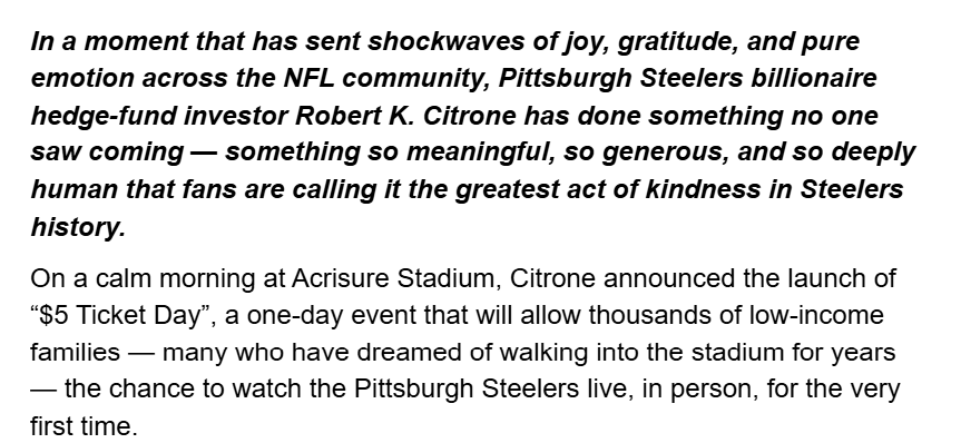 Home/Uncategorized/ST.GOOD NEWS: Pittsburgh Steelers Billionaire Robert K. Citrone Stuns the NFL World With Historic “$5 Ticket Day” for Low-Income Families Uncategorized ST.GOOD NEWS: Pittsburgh Steelers Billionaire Robert K. Citrone Stuns the NFL World With Historic “$5 Ticket Day” for Low-Income Families cuongmhs12311 seconds ago0 0 Less than a minute cuongmhs12311 seconds ago0 0 Less than a minute Facebook Twitter LinkedIn Tumblr Pinterest Reddit VKontakte Share via Email Print