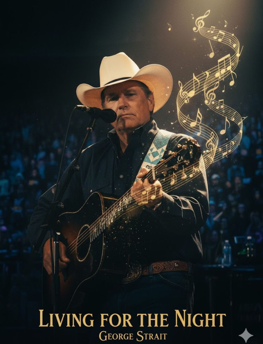 Some songs arrive not with thunder, but with a low, steady glow — the kind that reaches deep into the quiet corners of a listener’s heart. George Strait’s “Living for the Night” is one of those rare moments in country music where vulnerability stands shoulder-to-shoulder with strength. It is a song that feels lived-in, familiar, and deeply human. And at the center of its emotional pull lies a truth expressed in the opening sentiment: **”He stands beneath the dim lights, his voice soaked in memory and pain George Strait returns with “Living for the Night,” a song that cuts straight to the soul.