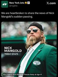 When the news broke on October 25, 2025, that Nick Mangold had passed away at the age of 41, the football world fell silent. For over a decade, he was the immovable anchor at the heart of the New York Jets’ offensive line — a player whose quiet strength, fierce loyalty, and unshakable presence defined what it meant to be a true teammate. But beyond the roar of stadiums and the glory of Sunday lights, Mangold’s legacy reached far deeper — into the hearts of those who knew the man behind the helmet.