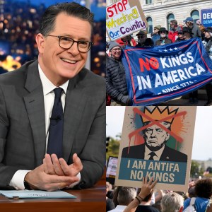As the United States grapples with escalating “No Kings” protests, Colbert’s unexpected message dropped like a thunderclap across social media — bold, emotional, and dangerously ambiguous. Within minutes, it began trending worldwide. Within hours, it had become the single most discussed topic online, overshadowing even the protests themselves.