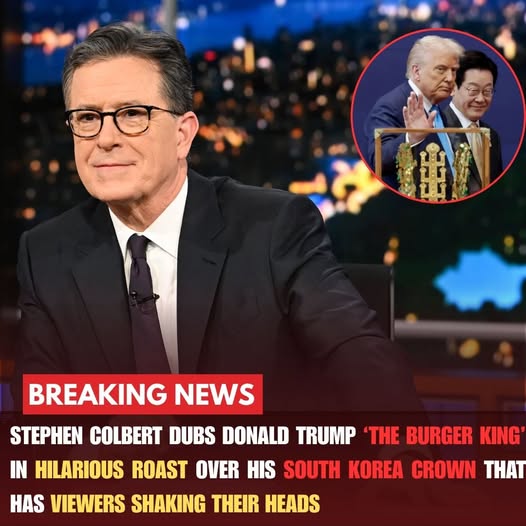 In a moment that blended comedy, politics, and pure showmanship, Stephen Colbert once again proved why he remains one of America’s most fearless late-night hosts. During a recent monologue that has since gone viral, Colbert unleashed a biting line about former president Donald Trump, dubbing him “The Burger King” after Trump was ceremoniously presented with a gold crown by officials in South Korea.