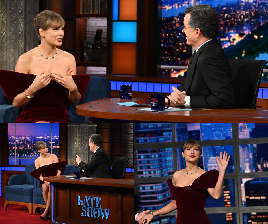 TN. “Taylor Swift Turns Heads in Burgundy Velvet Minidress During Surprise ‘Late Show’ Appearance”