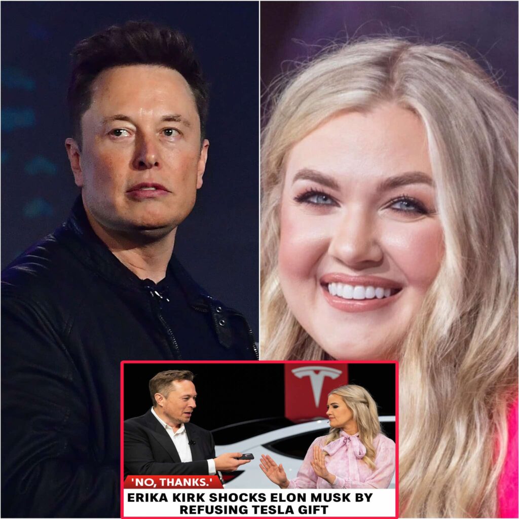 In an age when headlines are filled with tales of excess and extravagance, a single moment of quiet conviction has managed to capture the world’s attention. It happened when Erika Kirk — widow of a beloved faith leader and advocate for family values — was unexpectedly offered a brand-new Tesla by none other than Elon Musk. Cameras flashed, reporters leaned forward, and onlookers waited for the inevitable smile and acceptance. Instead, Erika uttered two words that stopped the room cold: “No, thanks.”