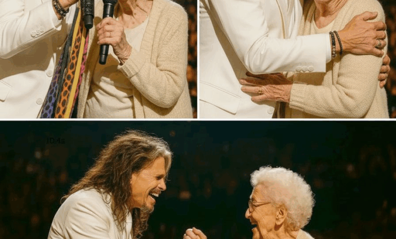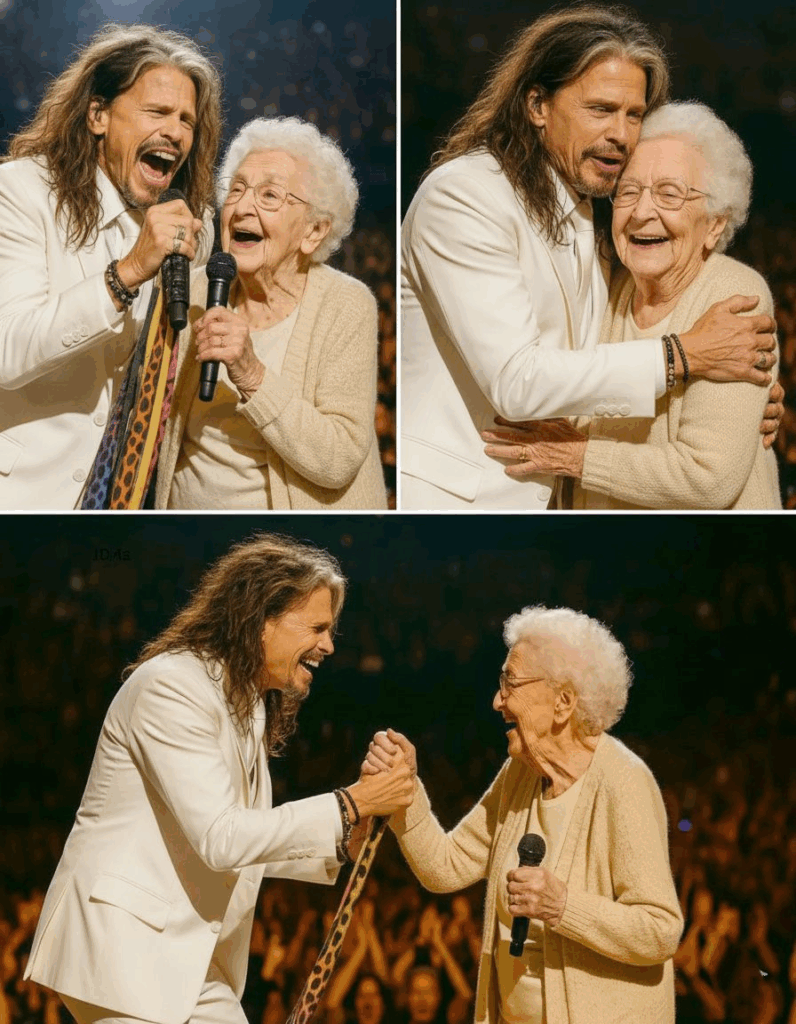 During an emotional performance, Steven Tyler – the legendary vocalist of Aerosmith, suddenly stopped in the middle of a song when he saw a silver-haired old lady with bright eyes standing in the front row, full of excitement and anticipation. Without hesitation, Tyler walked up, smiling and opening his arms and inviting her up on stage. The entire audience seemed to be silent when the old woman, despite her trembling hands, still gently walked up, her eyes under the stage lights were very peaceful.