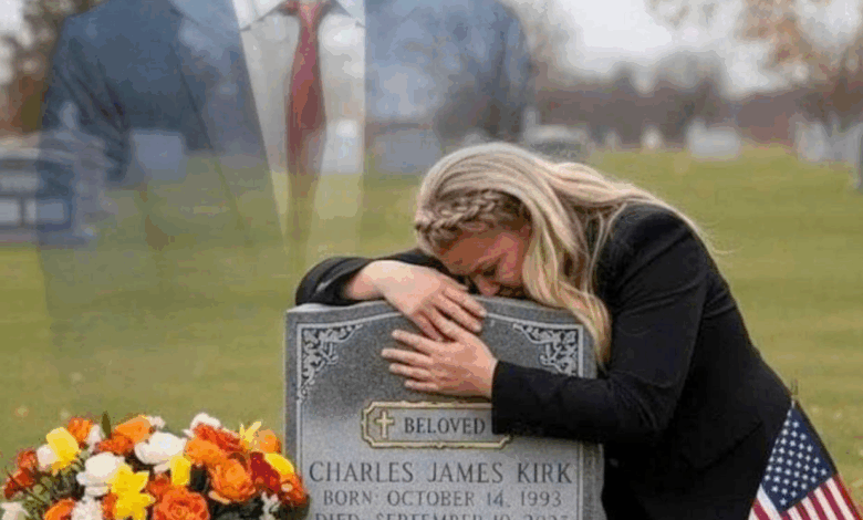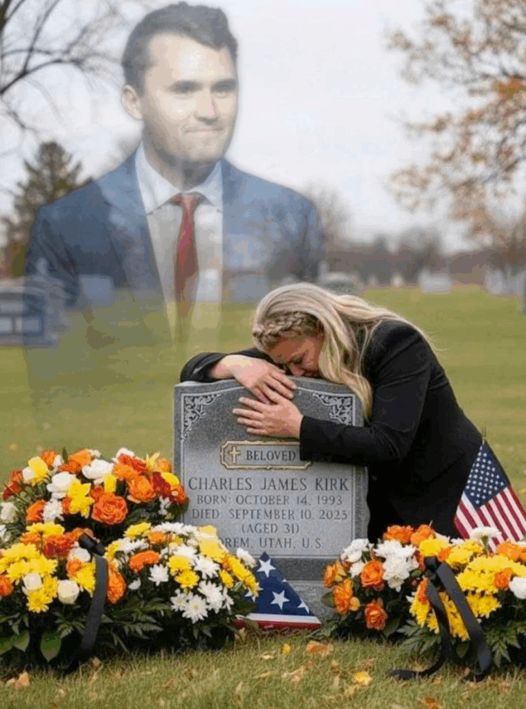 On a moonlit night heavy with wind and memory, she returned to his grave. The air was cold, the ground still damp from an earlier rain. There, before the marble carved with his name — CHARLIE KIRK — she fell to her knees, her tears cutting through the quiet like rain on stone.