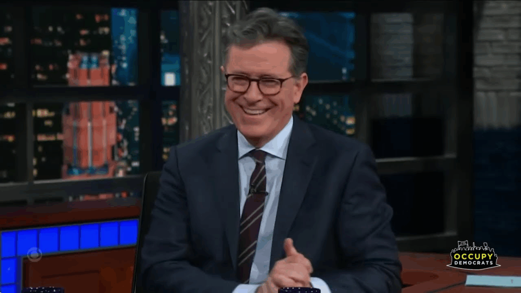 Colbert lets it go on for a beat, then cuts through the moment with one disarming line: essentially, “While I’ve got your attention… anybody hiring?”