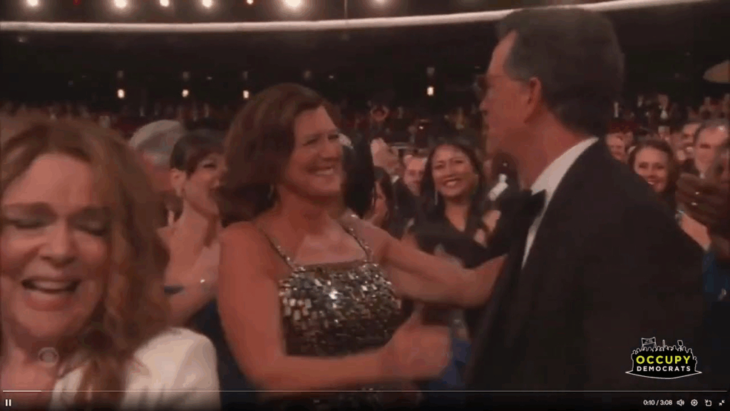 So when Colbert steps onto that stage, the room erupts. A full standing ovation. Not polite, not dutiful — emotional. They’re not just clapping for a comedian. They’re clapping for a man who refused to shut up.