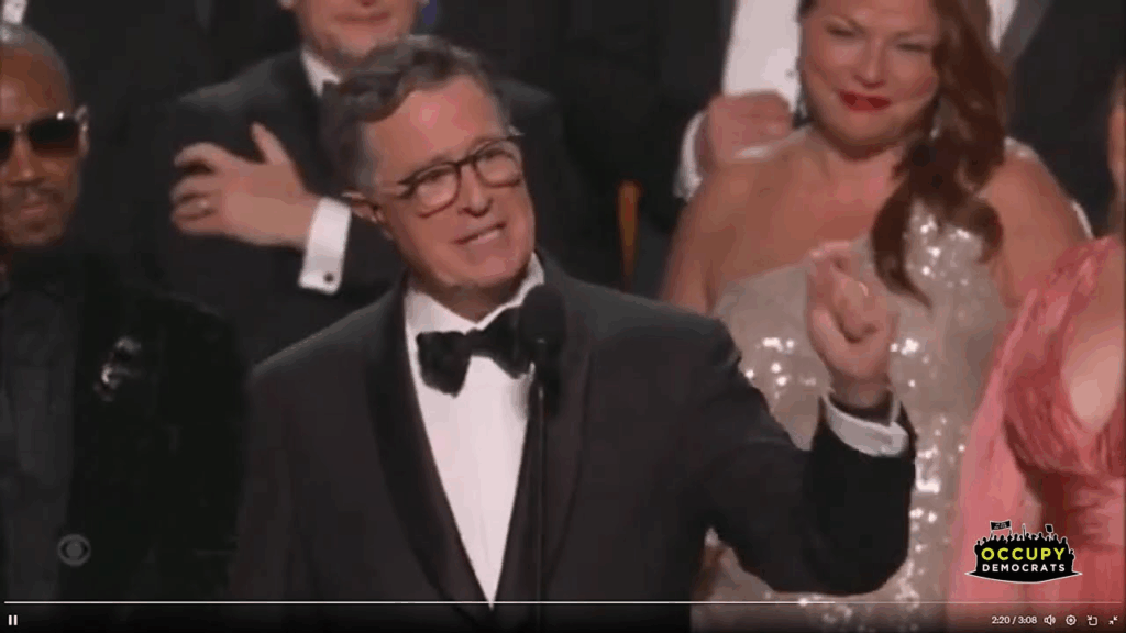 Stephen Colbert, long one of Trump’s sharpest late-night critics and an outspoken Roman Catholic, walks out to present an award at the Emmys in 2025. This is the same Colbert whose show, according to the host narrating the segment, was axed by CBS in a pathetic attempt to appease “the great dictator” in the White House.